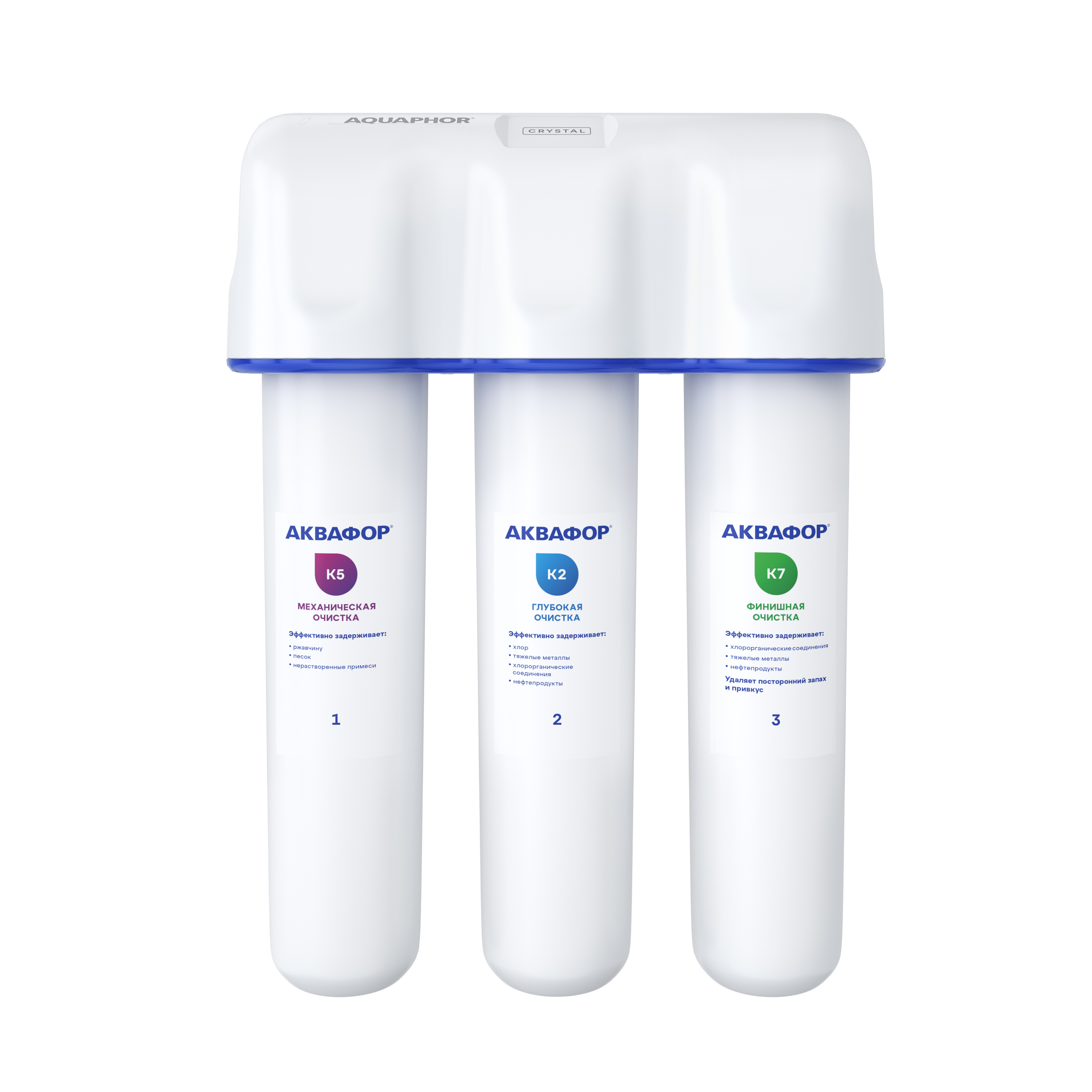 Три картриджа последовательно очищают воду от видимых механических примесей и растворенных вредных веществ. Блок механической очистки К5 продлевает ресурс сорбционных модулей, модуль глубокой очистки К2 – отфильтровывает частицы до 3 микрон. Третий модуль К7 обеспечивает финишную очистку от частиц до 0,8 микрон (что в 125 раз тоньше человеческого волоса).